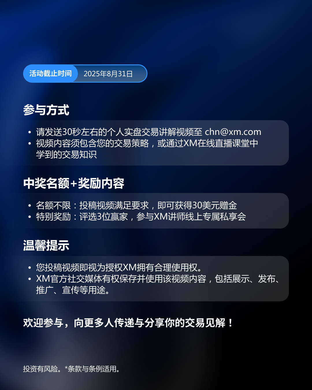现在开始至 2025年8月31日,发送30秒左右的个人实盘交易讲解视频至chn@xm.com,便可参与“XM视频分享活动”。