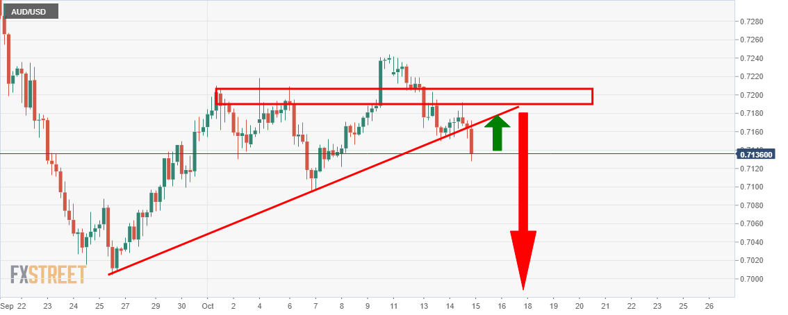 受这一消息影响,澳元/美元迅速下跌,幅度高达0.57%。空头正在突破关键趋势线支撑。如果长期时间框架与看跌行情同步,这将是熊市的方向。不过,空头将迫切希望看到价格在10月初低点上方横盘整理,并开始提供折价做空或重新测试反向趋势线和阻力位的机会。