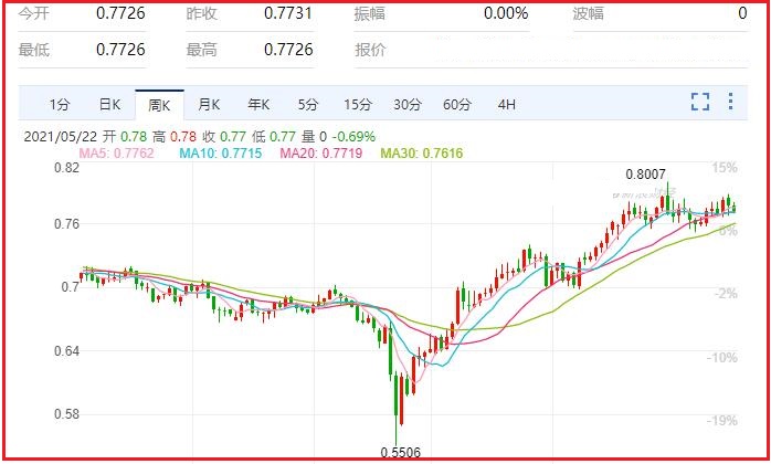 1.澳元/美元货币对汇率本周跌幅0.68%,振幅1.26%,最高0.7811,最低0.7713,收于0.7730,周线收一阴线;