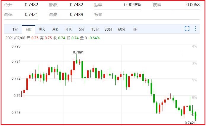 澳大利亚也并不都是坏消息。澳大利亚的达尔文、珀斯和布里斯班等城市于本周初结束了封锁状态。病例轨迹以及相应的封锁措施可能会大幅影响中短期内的经济增长。此外澳大利亚的疫苗接种工作仍落后于美国和欧洲,这给当地增添了新冠病例未来再次爆发的风险。汇价现报0.7435,跌幅0.63%。