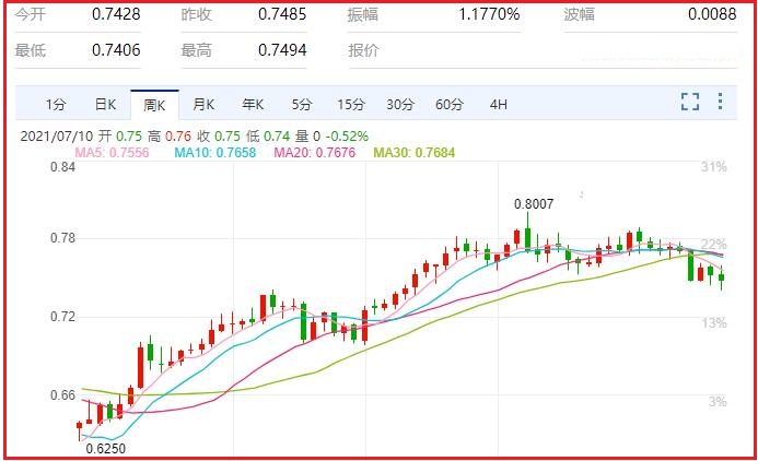 1.澳元/美元货币对汇率本周跌幅0.46%,振幅2.79%,最高0.7598,最低0.7410,收于0.7492,周线收一阴线;
