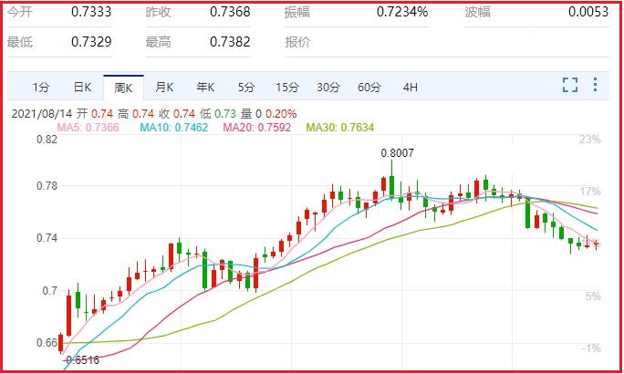 1.澳元/美元货币对汇率本周涨幅0.23%,振幅0.97%,最高0.7387,最低0.7316,收于0.7373,周线收一小阳线;