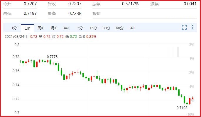 铁矿石价格在本周二跌至136.7美元/吨,这意味着铁矿石价格自5月份站上237美元/吨的历史高位以来,已累计下跌超过42%。Morgan Stanley分析认为,任何新的基建刺激计划转化为钢铁需求将需要6个月的时间,加上中国房地产降温政策使建筑业难以迅速复苏,来自中国的铁矿石需求量将持续减少。Morgan Stanley预计,铁矿石价格将继续走低,并在今年四季度跌至112美元/吨。在供给端来看,咨询公司Wilson指出,与往年一样,由于有利的天气和更少的供应链问题,铁矿石将在年底进入供应高峰期,下半年铁矿石出货量预计将比上半年增加6000万吨,而这正值中国市场的冬季需求低谷。同时delta变异毒株确实加剧了澳元的抛售。汇价现报0.7231,涨幅0.26%。
