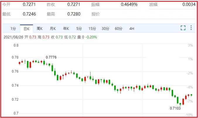 澳大利亚联邦银行策略师Kim Mundy在一份报告中写道:“在周五之前,对全球增长的担忧或缺乏担忧可能仍将是美元的主要推动力。”“如果鲍威尔主席强调经济数据与近期缩减计划一致,那么周五美元可能会走高。”她还说,该行预计美联储将在9月宣布缩减购债规模的计划,实际上在10月开始缩减购债规模,并在2022年9月之前结束。“我们认为美元的上行趋势还将继续。”汇价现报0.7258,跌幅0.25%。