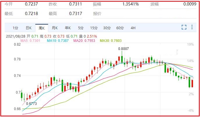 1.澳元/美元货币对汇率本周涨幅2.45%,振幅2.73%,最高0.7317,最低0.7122,收于0.7313,周线收一长阳线;