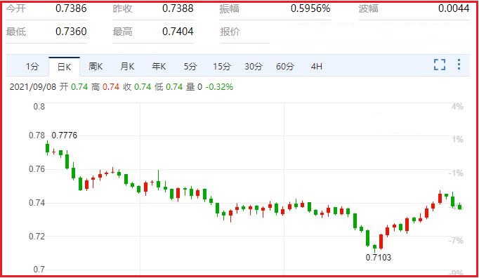 就澳币而言,周二的波动表明,在一段时间内澳币兑美元表现不佳之后,国内因素仍可能对澳元估值产生影响,而美联储自己的缩减目标主导了利差。澳洲央行在周二的9月会议上继续履行承诺,削减其2000亿澳元的大规模货币刺激计划,认为经济急剧下滑只是暂时的。汇价现报0.7355,跌幅0.45%。