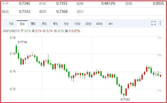 上周澳储行决定维持缩减量宽计划,将每周购债计划从50亿澳元减少至4亿澳元,但将购债计划延期至2022年2月。澳储行政策制定者澄清说,澳储行决议与“经济放缓”直接相关。经济复苏以及与新冠病毒Delta变种疫情相关的不确定性增加。“声明还表示,决策者认为经济扩张持续受挫可能是暂时的。澳储行将基准利率维持在0.10%不变,3年期债券收益率目标维持在同一水平。另外,由于新冠病毒Delta变种疫情不断席卷北半球,引发市场对全球经济复苏前景的质疑,美元因市场情绪不佳获得提振。尽管避险需求低于平均水平,但大多数央行采取观望的态度也打压市场。澳元买兴减弱,但仍远未表明澳元/美元将出现下跌。汇价现报0.7360,涨幅0.10%。