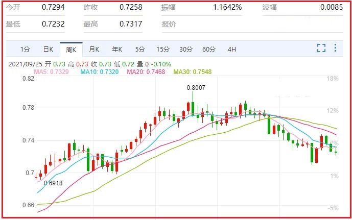 1.澳元/美元货币对汇率本周跌幅0.08%,振幅1.31%,最高0.7316,最低0.7221,收于0.7260,周线收一阴星;