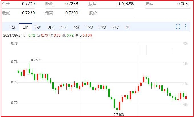 澳元上行道路仍面临着诸多风险。美国国债收益率上周在美联储9月利率决议之后大涨。在美联储表态向逐步缩减购债(即Tapering)更近一步之后,交易们会大举抛售政府债券。作为基准的十年期国债收益率上涨到来6月份以来的最高水平。债券收益率与债券价格走势为反比关系。在收益率上涨之后,美元本周可能继续走高,特别是当收益率曲线前端的利率上升速度快过曲线后端的利率上升速度的情况下——预示美元走强。汇价现报0.7264,涨幅0.06%。