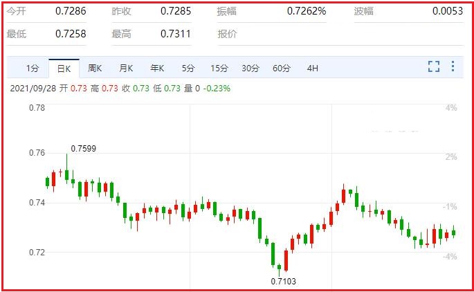 大宗商品货币受惠于美元疲弱以及中国股市因恒大相关担忧出现缓解而表现更好。然而,全球股指涨跌互现,投资者正权衡美国经济好转以及美国即将缩减量宽的经济表现。因此也就限制了澳元的反弹表现。汇价现报0.7267,跌幅0.28%。