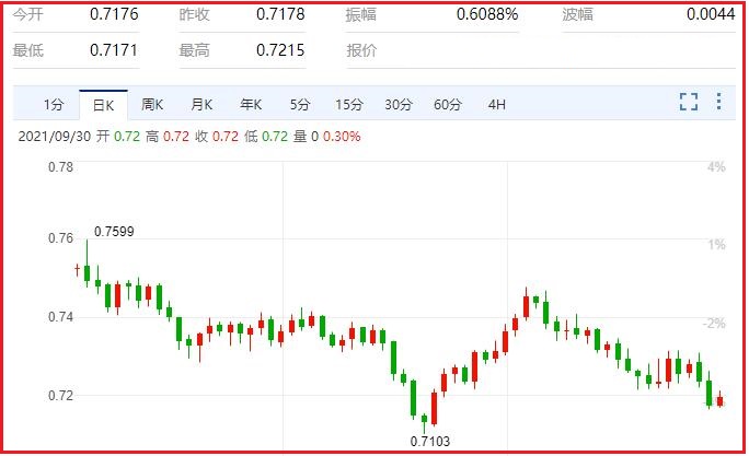 尽管美国政府在债务上限问题上陷入僵局,有可能导致停摆,但作为全球最大的储备货币,美元在市场压力大的时候被视为一种避险押注。美元最近几天走强,因投资者转而关注对全球经济放缓、能源价格上涨和美债收益率大幅上升的担忧。汇价现报0.7205,涨幅0.40%。