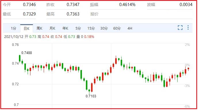 本月初,密歇根大学消费者信心调查预期中值显示, 9月消费者对未来五到十年通胀率的预期升至3%,追平5月份触及的近8年高点。截至10月1日, 美联储自己制定的5年期远期盈亏平衡通胀率为2.28%。5月11日达到2.55%,为2014年2月以来最高水平。截至10月8日, 彭博开发的一个更新频率更高的类似指标从10月1日的2.24%升至2.36%。持续的供应链混乱有可能将通胀维持在高位,提升通胀预期,并迫使美联储在2022年提前加息。汇价现报0.7365,涨幅0.24%。