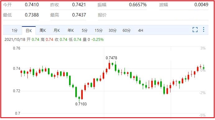 周一澳元/美元未趁着前期涨扫,接近上周五触及的愈一周高位,自 0.7435 区域温和回调。美元疲弱,股市维持谨慎,被视为风险货币澳元/美元的利空。加上中国宏观经济数据低于预期,限制中国在汇市的代理货币澳元/美元的上涨空间。中国国家统计局周一报告称,中国这一全球第二大经济体三季度经济增长季率和年率分别降至 0.2% 和 4.9%,而前值分别为 1.3% 和 7.9%。