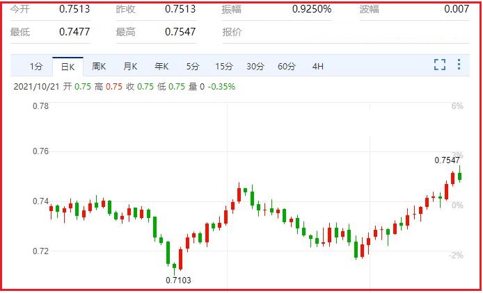 市场预期看法与澳洲央行说法之间的背离程度扩大之际,其他发达国家央行正开始撤回或考虑缩减疫情期间的刺激措施。RBC资本市场澳洲固定收益策略主管Su-Lin Ong表示:“我们预计澳洲央行将介入并捍卫其收益率曲线控制(YCC)目标,可能在本周。”根据其收益率曲线控制(YCC)政策,澳洲央行的目标是将三年期收益率维持在0.1%。她补充说:“如果它不介入...就很难不得出结论认为,澳洲央行的政策立场出现了一些新的转变。”汇价现报0.7489,跌幅0.36%。