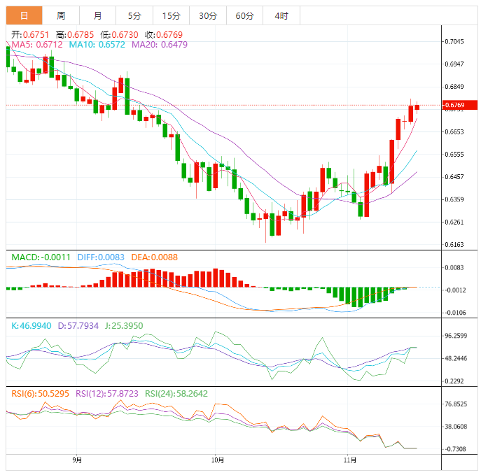 澳元技术面:澳元兑美元最近的交易被限制在图表中出现的看涨的三角模式内,因此,价格需要突破0.6760来激活该模式的积极影响,然后反弹到我们的下一个积极目标,达到0.6900。因此,在价格稳定在0.6650上方的条件下,看涨概述仍将有效。