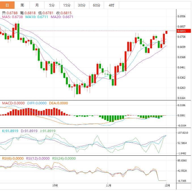 也就是说,由于多头欢呼前一天突破了9月中旬的向下倾斜阻力线,以及8 - 10月上行的61.8%斐波那契回档位(0.6770附近),澳元对将出现三天的上行趋势。