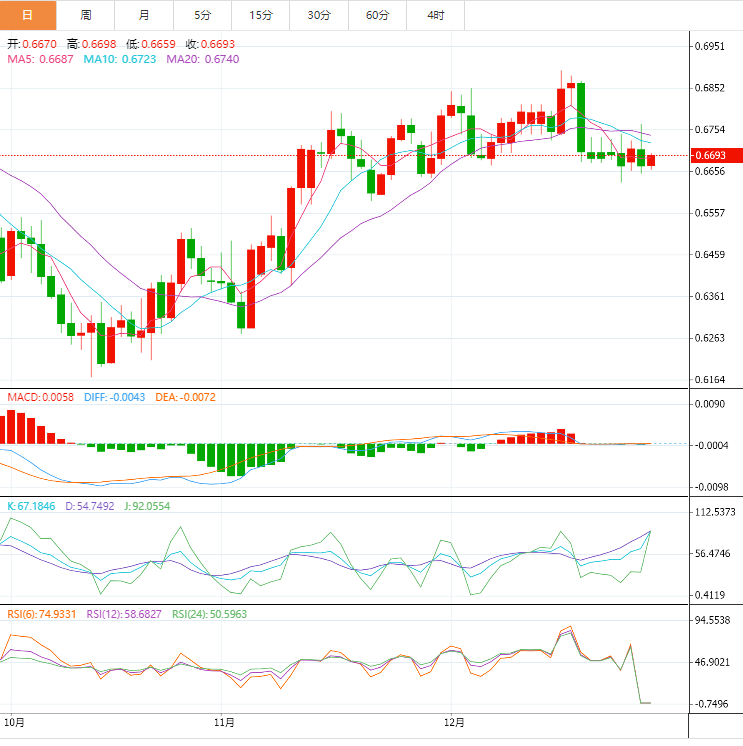 澳元技术面:澳元/美元进一步下跌,并创下日线新低0.6672。周四早盘,澳元/美元录得0.6767,录得一周以来的最高水平。澳元/美元这次下跌出现在美元全盘走强的环境下。美国经济数据公佈后,美元上涨势头强劲。美国第三季度实际GDP年化季率终值修正至3.2%,好于前值2.9%。第三季度国内生产总值报告中的价格分项也得到调高。美国上周初请失业金人数升至21.6万人,低于期值22.2万人,持续申请失业救济人数数週来首次下降,从167.8万人降至167.2万人。接下来,随着美国核心个人消费支出(PCE)价格指数(美联储首选的通胀指标)以及11月耐用品订单的关键出炉,市场情绪和假日情绪的好坏好坏可能会考验澳元/美元买家。