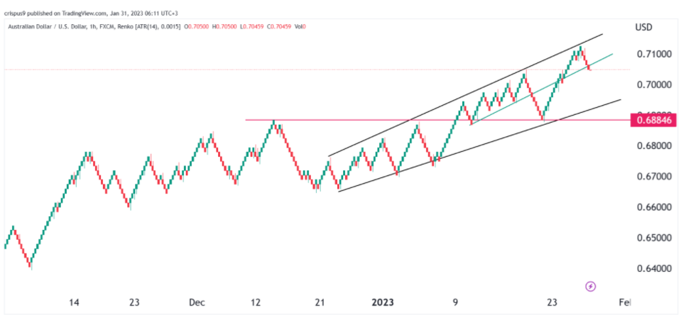 与此同时,美元上涨缺乏看涨信心,因为市场美联储在周三结束的两日会上宣布加息25个基点的押注上升。加上市场规避风险,导緻美债收益率小幅下跌,利空美元。在押注澳元兑美元进一步下跌之前应保持谨慎。