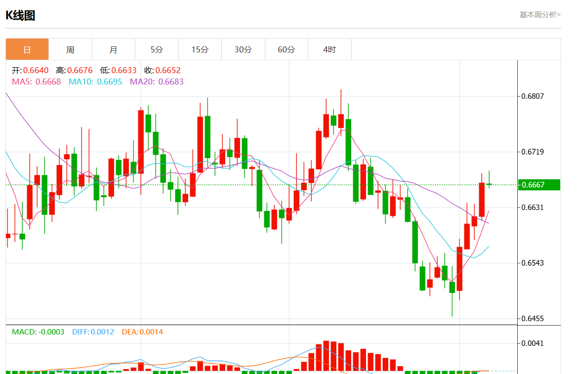 周三盘中,澳元/美元最新报0.6668,日图跌0.03%