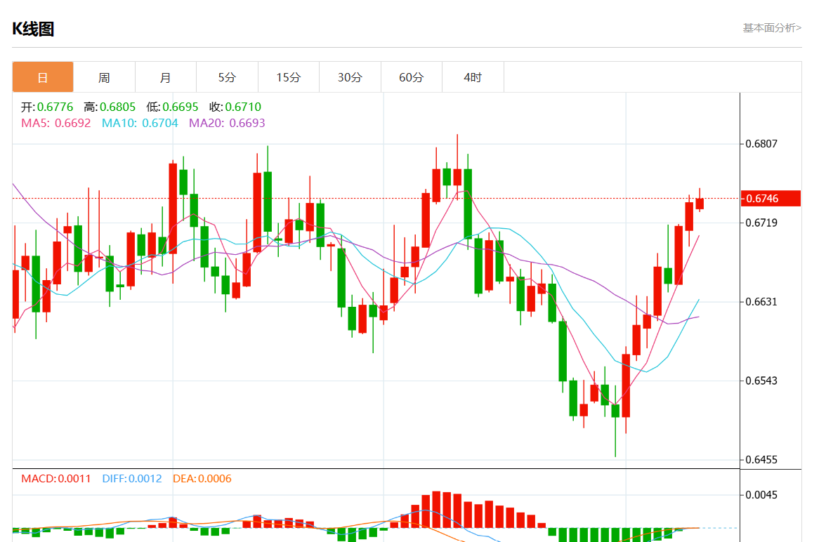 周一盘中,澳元/美元最新报0.6746,日图涨0.06%