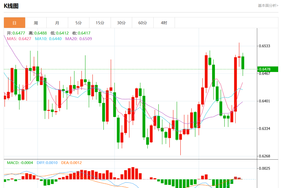 周四盘中,澳元/美元报0.6478,跌幅0.46%。