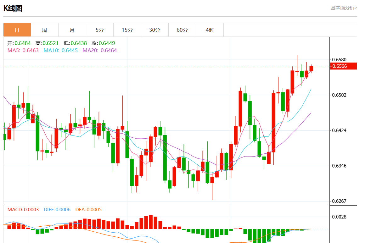 周五盘中,澳元/美元报0.6567,涨幅0.17%。
