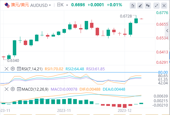 澳元/美元保持在50日和200日均线上方,肯定了价格看涨的信号。澳元/美元突破0.67296美元的阻力位将使多头在0.67500美元的价格上运行。