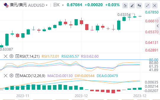 澳元/美元周一上涨0.10%。继周五上涨0.06%后,澳元周一收盘报0.67061美元。澳元跌至0.66903美元的低点,随后触及0.67352美元的高点。