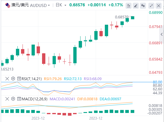 周三,澳元/美元上涨0.33%。继周二上涨0.48%后,澳元收盘报0.68464美元。澳元跌至0.68159美元的低点,随后升至0.68515美元的高点。
