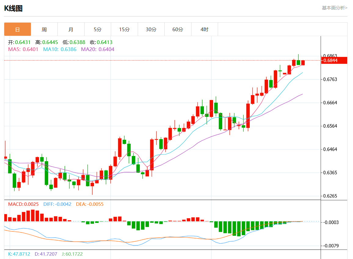 周五盘中,澳元/美元报0.6845,涨幅0.28%。