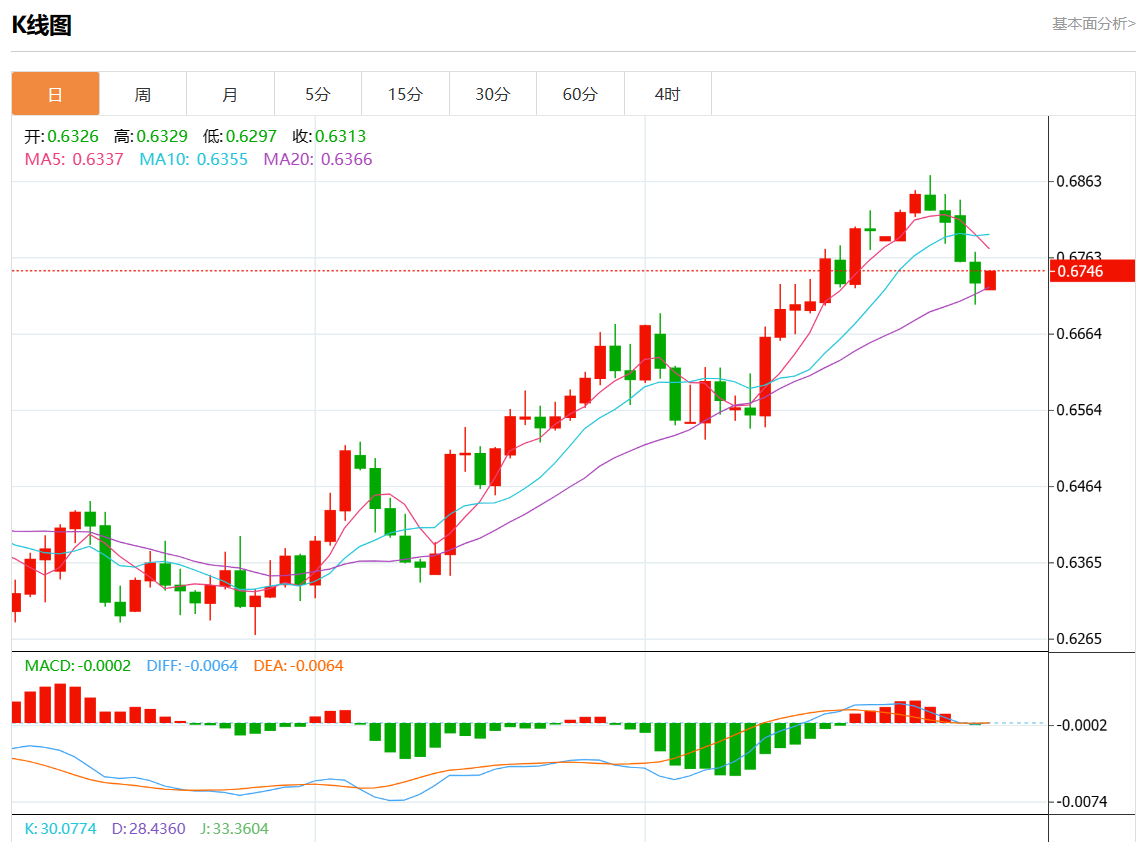 周四盘中,澳元/美元报0.6746,涨幅0.23%。