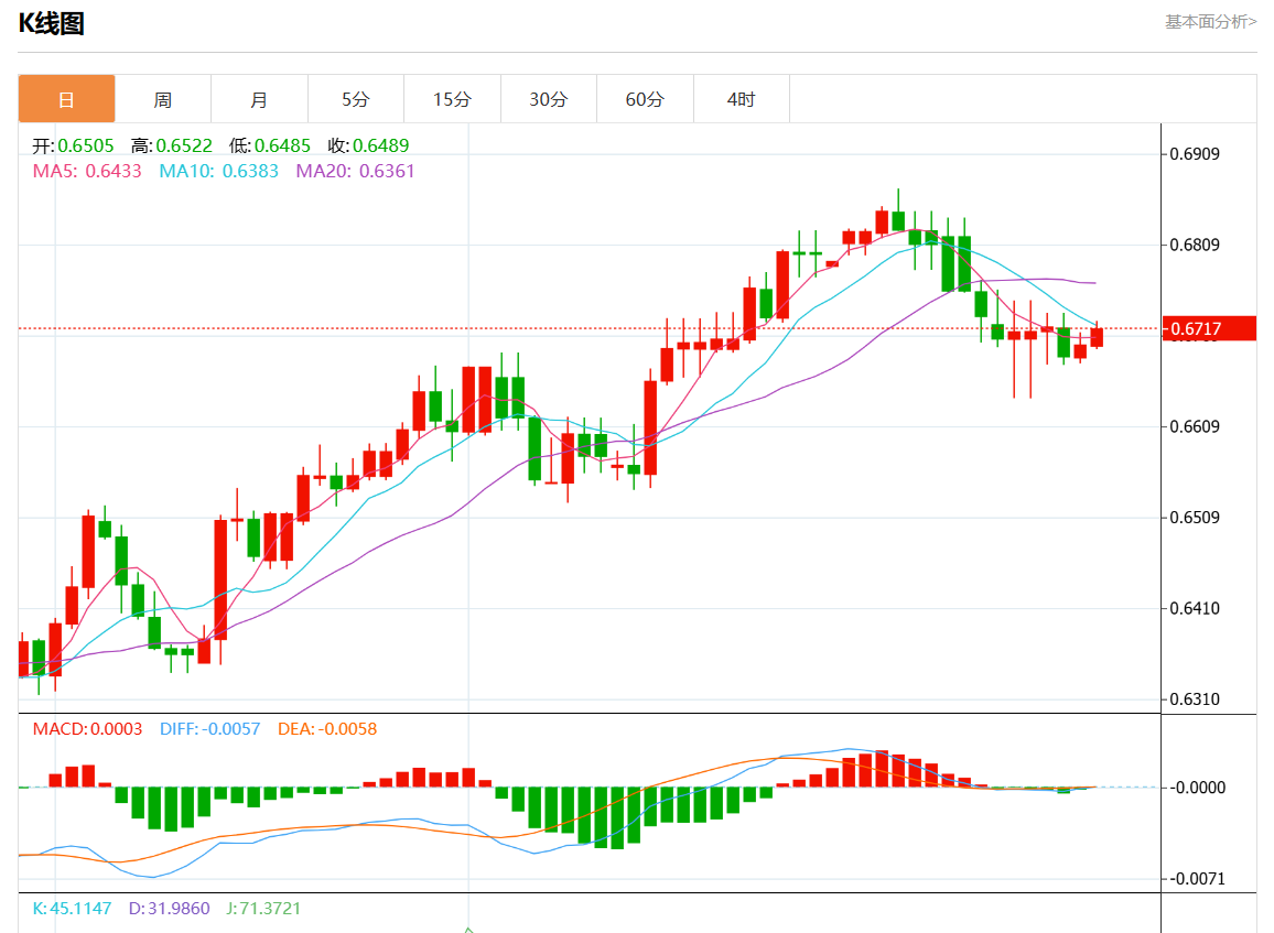 周四盘中,澳元/美元报0.6719,涨幅0.30%。