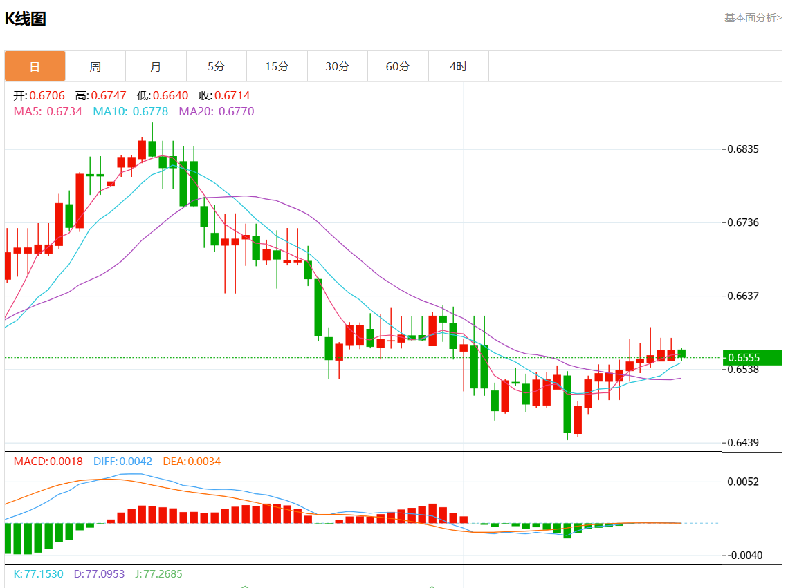 周一盘中,澳元/美元报0.6554,跌幅0.15%。