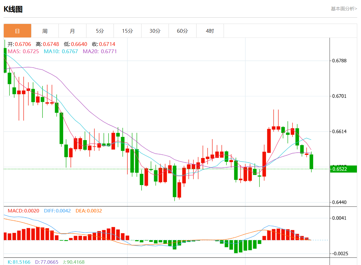 周二盘中,澳元/美元报0.6521,跌幅0.58%。