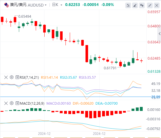 周三,澳元/美元交易于0.6210附近,保持看跌前景,因为它仍然在日线图上的下降通道内。14日相对强弱指数(RSI)回落至30水平,表明看跌动能可能加剧。