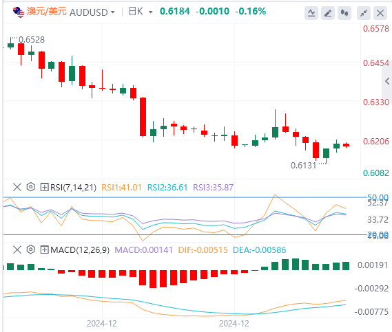 周三,澳元/美元在0.6190附近交易,保持看跌前景,因为它仍处于日线图的下降通道内。14日相对强弱指数(RSI)仍高于30水平,表明从超卖状态恢复。