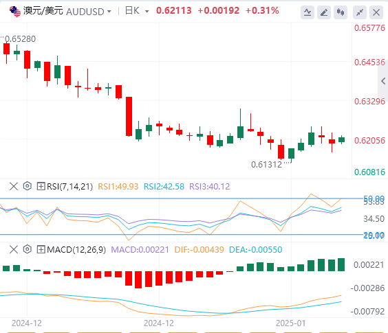 由于中国强劲的经济数据,澳元也上涨。中国的国内生产总值(GDP)在第三季度增长4.6%后,2024年第四季度同比增长5.4%。在报告期内,数据大幅超出市场普遍预期的5%。此外,12月年度零售销售增长3.7%,高于预期3.5%和前值3.0%,而工业生产达到6.2%,高于预测的5.4%和11月的5.4%。