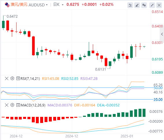 在上行方面,澳元/美元可能测试0.6300的心理阻力位,下一个目标接近上升通道的上边界0.6320附近。