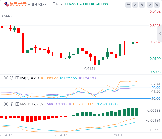 周五,澳元/美元在0.6280附近交易,日线图分析显示在上升通道模式内移动,表明可能的看涨倾向。此外,14日相对强弱指数(RSI)仍高于50,强化了积极的市场情绪。
