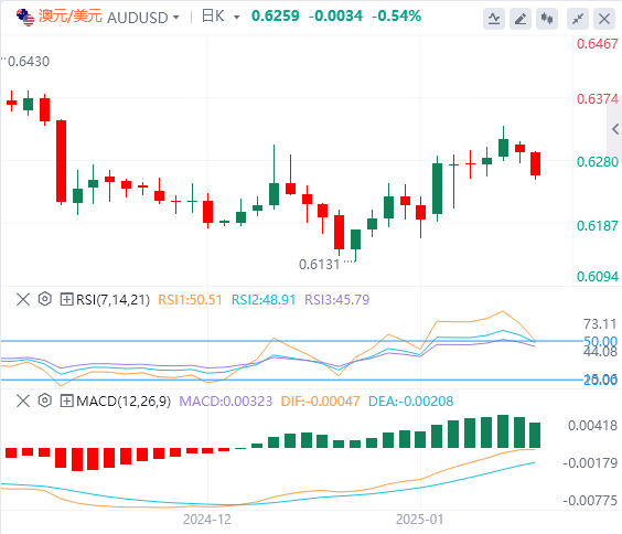 澳元/美元周二交投于0.6260附近,局限在日线图的上升通道内,暗示潜在的看涨偏见。14天相对强弱指数(RSI)位于50关口,表明市场情绪中性。