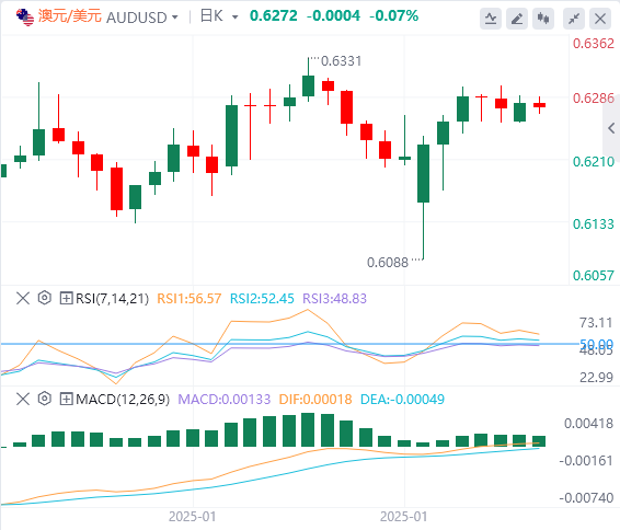 澳元/美元周二徘徊在0.6270附近,测试日线图上的9天和14天指数移动平均线(EMA)。跌破这些水平可能会削弱短期价格动能。14天相对强弱指数(RSI)保持在50关口上方,表明看涨偏见活跃。