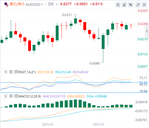 澳元/美元周二徘徊在0.6270附近,测试日线图上的9天和14天指数移动平均线(EMA)。跌破这些水平可能会削弱短期价格动能。14天相对强弱指数(RSI)保持在50关口上方,表明看涨偏见活跃。