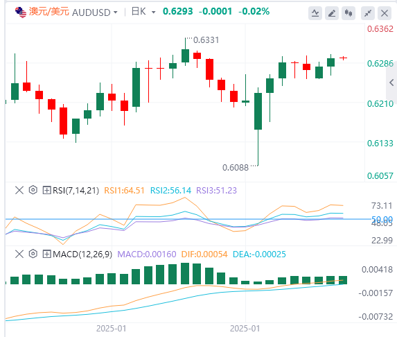 澳元/美元周三徘徊在0.6290附近,保持在日线图上9天和14天指数移动平均线(EMA)上方的位置。这表明短期价格动能更强。此外,14天相对强弱指数(RSI)保持在50关口上方,加强了看涨偏见。