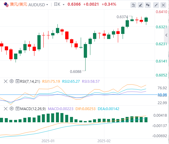 澳元/美元周四徘徊在0.6330附近,交易于上升通道内,表明市场情绪看涨。14天相对强弱指数(RSI)保持在50以上,加强了积极的前景。