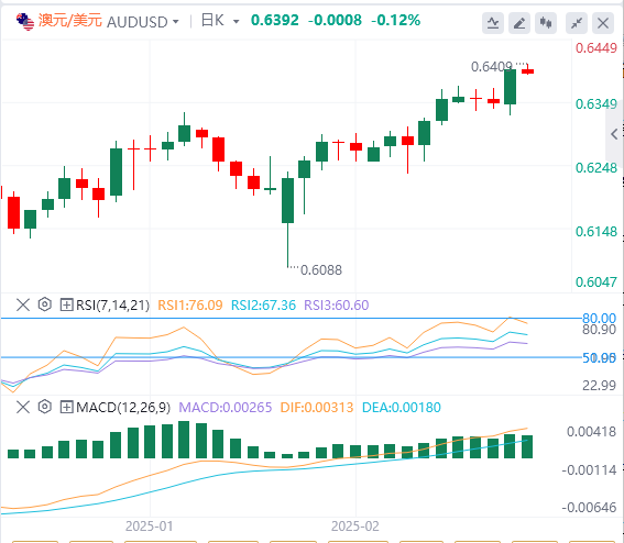 澳元/美元周五徘徊在0.6400附近,交易于上升通道内,表明市场情绪看涨。14天相对强弱指数(RSI)保持在50以上,加强了积极的前景。