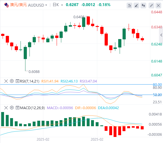 澳元/美元周二交投于0.6260附近,日线图的技术分析显示该货币对跌破9天指数移动平均线(EMA),表明短期势头减弱。此外,14天相对强弱指数(RSI)已跌破50,表明转向看跌偏见。