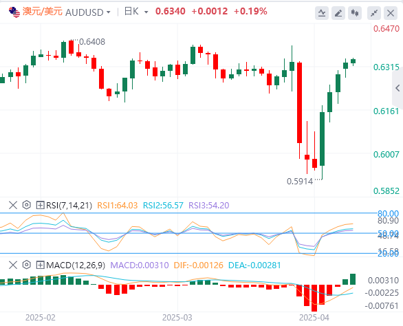 从好的方面来看,澳元/美元可能会瞄准心理阻力位0.6400,然后是四个月高点0.6408。