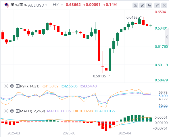 澳元/美元周四在0.6360附近交易,日线图上的技术指标反映看涨基调。该货币对继续保持在9天指数移动平均线(EMA)上方,而14天相对强弱指数(RSI)稳定在50以上,表明持续的上涨势头。