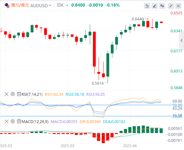 澳元/美元周五徘徊在0.6410附近,日线图技术面保持看涨倾向。该货币对仍高于9天指数移动平均线(EMA),而14天相对强弱指数(RSI)稳定在50关口上方,表明继续上涨势头。