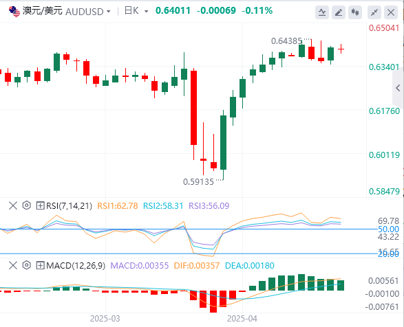 澳元/美元周五徘徊在0.6410附近,日线图技术面保持看涨倾向。该货币对仍高于9天指数移动平均线(EMA),而14天相对强弱指数(RSI)稳定在50关口上方,表明继续上涨势头。